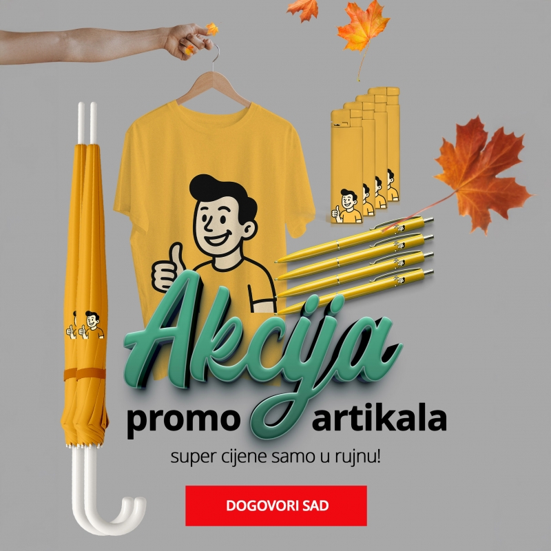 Novo u tiskari - jer dobre stvari zaslužuju dobar otisak.Mi volimo promotivne proizvode. Bilo da ste mali startup ili velika korporacija, možemo vam pomoći da sa stilom promovirate svoj brend ili organizaciju.Izaberite idealan poslovni poklon za vaše partnere i klijente. Svi proizvodi iz naše ponude mogu se brendirati vašim logotipom ili dizajnom. Tiskamo promotivne poklone za svaku vašu želju, po cijenama za svaki budžet. ... Asortiman prilagođenih boca i šalica, olovaka i upaljača, kapa i majica, radnih odijela, privjesaka za ključeve, te kalendara i rokovnika koji promoviraju vaš posao.Tisak je moguć u raznim tehnikama, ovisno o vrsti proizvoda.